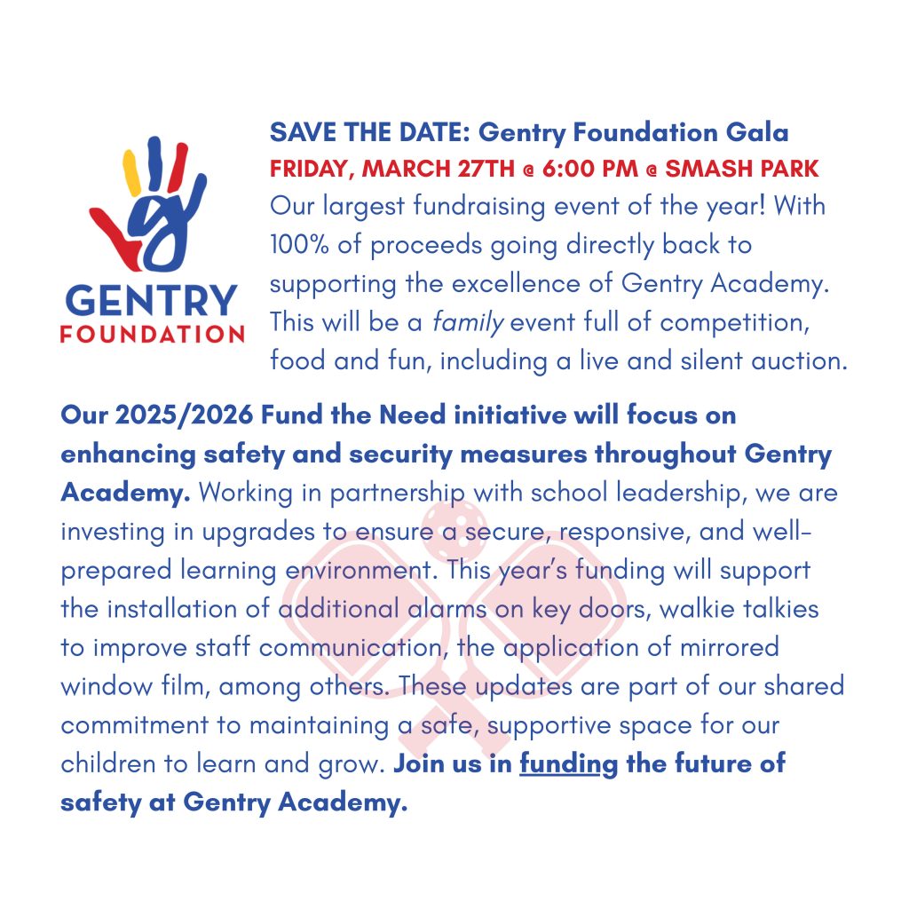 We are committed to offering programs and services that enhance academic growth, athletic development, and leadership skills, supporting the holistic journey of each individual within the Gentry community. Come join us at our community events as we raise funds to build a stronger, more vibrant community for future generations.
